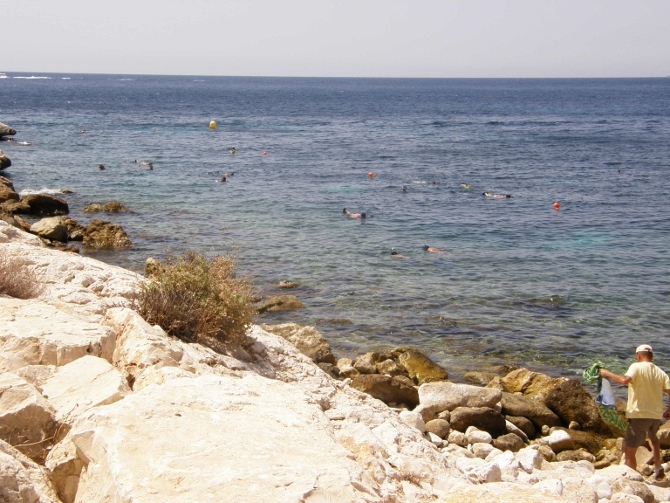 La cala El Racó, situada en la cara oeste del Peñón de Ifach cuenta con cinco paneles acuáticos informativos del fondo marino calpino