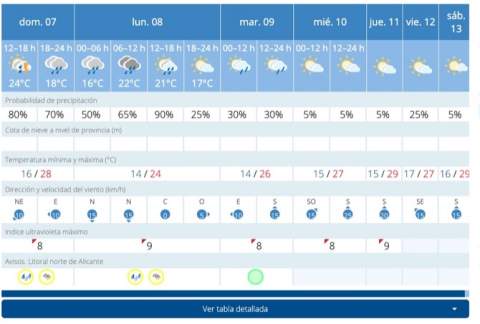 Según el avance de la Agencia Estatal la previsión de lluvia ronda el 100% durante las horas centrales del día, y baja hasta 45% a partir de las 18 horas.