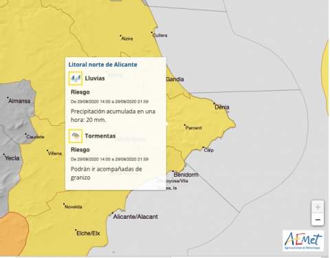 Según la información que ofrece el Laboratorio de Climatología de la Universidad de Alicante en su página de facebook: "en la provincia de Alicante esperamos algunos chubascos dispersos que en general serán débiles o moderados, ya que no estaremos situados en el sector de mayor inestabilidad de la gota fría. Incluso puede que tengamos algunos ratos de sol. En la Marina Alta y en el norte y este del Comtat sí que puede llover algo más".
