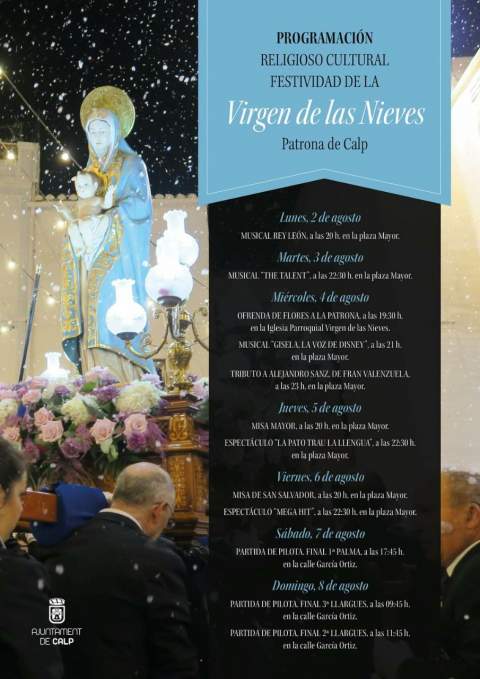 Calp inicia el lunes las fiestas patronales en Honor a la Virgen de las Nieves organizadas por la Comisión de Fiestas de 2022 y el Ayuntamiento de Calp, se trata de las primeras fiestas sin ningún tipo de restricciones y que vuelven a celebrarse con total normalidad tras la pandemia.