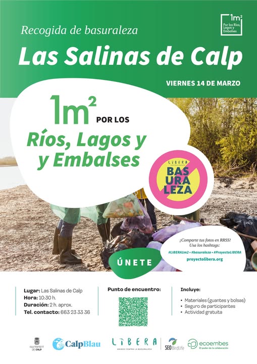 El próximo viernes 14 de marzo, la localidad de Calp se unirá a la iniciativa medioambiental '1m² por los ríos, lagos y embalses', impulsada por el Proyecto Libera. La acción consistirá en una jornada de recogida de basuraleza en la zona de Las Salinas, con el objetivo de contribuir a la conservación del entorno natural y sensibilizar a la ciudadanía sobre la importancia de mantener limpios estos espacios.