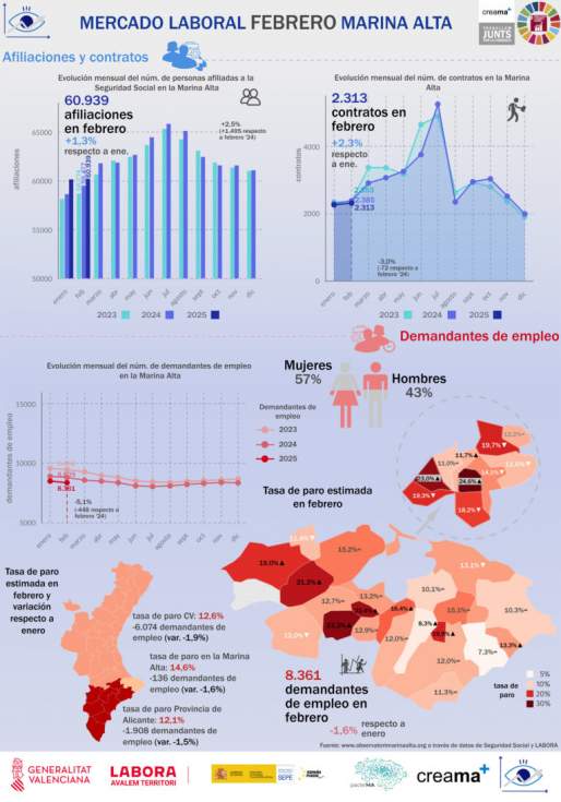 Según los datos del Observatori Marina Alta de CREAMA y PACTE’MA, dentro del programa AVALEM TERRITORI de la Generalitat Valenciana, la tasa de paro en la Marina Alta se redujo en 0,32 puntos, situándose en el 12,06%, inferior al 12,90% de febrero de 2024. Este porcentaje sigue siendo mejor que el de la provincia de Alicante (14,35%) y la Comunitat Valenciana (12,60%).