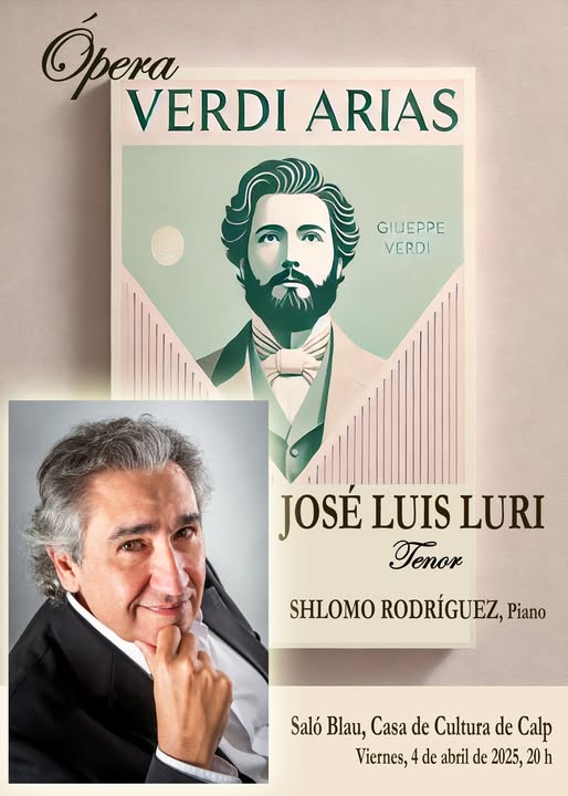 El próximo viernes 4 de abril, el Saló Blau de la Casa de Cultura de Calp será el escenario de un concierto lírico en homenaje al compositor Giuseppe Verdi, interpretado por el tenor José Luis Luri, acompañado al piano por Shlomo Rodríguez.