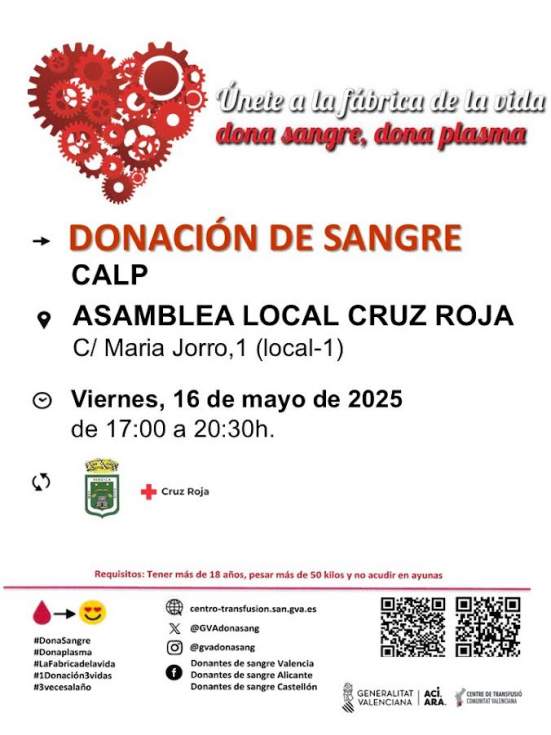 La organización anima a la población calpina y de la comarca a participar activamente en esta jornada solidaria, contribuyendo a garantizar el abastecimiento de los bancos de sangre en los centros hospitalarios de la Comunitat Valenciana.