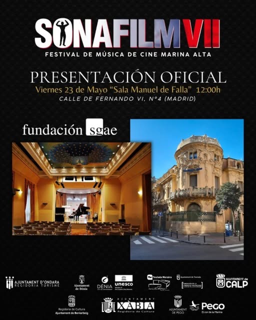 El próximo viernes 23 de mayo a las 12:00 horas, la sede de la SGAE en Madrid acogerá la presentación oficial de la 7ª edición de SONAFILM, el Festival de Música de Cine de la Marina Alta, que se ha consolidado como el único evento de la Comunitat Valenciana dedicado íntegramente a la música del séptimo arte.