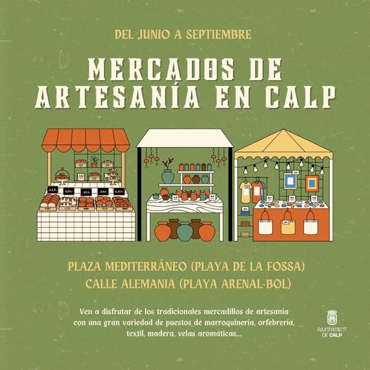 Desde el 1 de junio y hasta finales de septiembre, Calp acoge sus tradicionales Mercados de Artesanía, organizados por el Ayuntamiento en dos enclaves emblemáticos: la Plaza Mediterráneo, junto a la playa de la Fossa, y la calle Alemania, en la playa del Arenal-Bol.