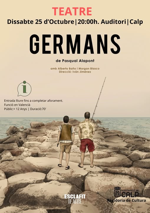 Calp acoge este sábado, 25 de octubre, una nueva cita teatral con la representación de “Germans”, una pieza escrita por Pasqual Alapont, interpretada por Alberto Baño y Morgan Blasco, y dirigida por Iván Jiménez. La función tendrá lugar a las 20:00 horas en el Auditorio de la Casa de Cultura, con entrada libre hasta completar el aforo de 126 plazas.