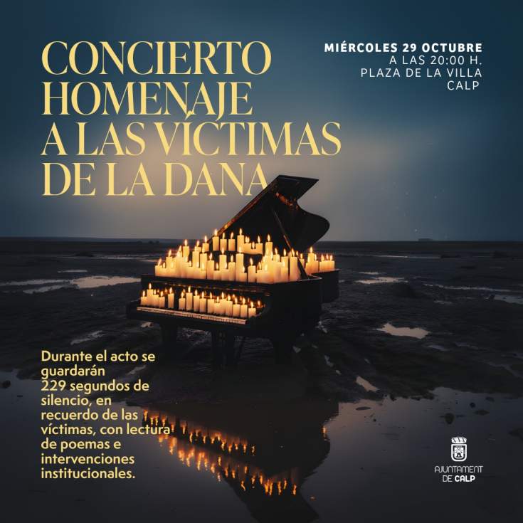El Ayuntamiento de Calp ha organizado un concierto homenaje a las víctimas de la DANA de Valencia con motivo del primer aniversario de la tragedia. El acto se celebrará el miércoles 29 de octubre, a las 20 horas, en la Plaza de la Villa.
