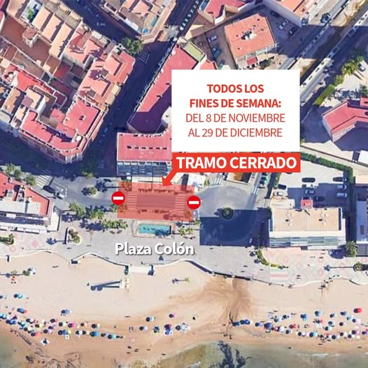 El Ayuntamiento de Calp ha anunciado el cierre al tráfico de la plaza Colón todos los fines de semana, desde el sábado 8 de noviembre hasta el domingo 29 de diciembre, en horario de sábado a partir de las 14:00 horas hasta el lunes a las 4:30 horas.