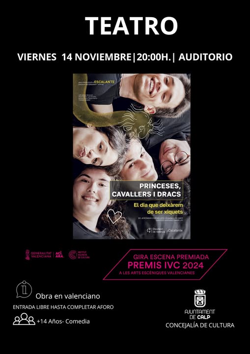 El Auditori de la Casa de Cultura de Calp será el escenario, el viernes 14 de noviembre de 2025 a las 20:00 horas, de la representación teatral “Princeses, Cavallers i Dracs. El dia que deixàrem de ser xiquets”, una propuesta que forma parte de la Gira Escena Premiada del Institut Valencià de Cultura (IVC).