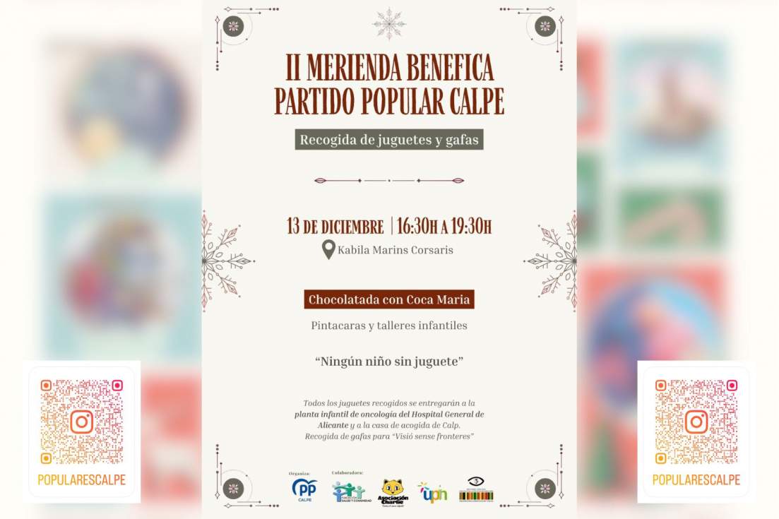 El Partido Popular de Calpe celebrará este sábado 13 de diciembre la II Merienda Benéfica, una cita solidaria que tendrá lugar en la kàbila Marins Corsaris entre las 16:30 y las 19:30 horas. El encuentro, centrado en la infancia, impulsará una recogida de juguetes destinados a los niños de la planta de Oncología Infantil del Hospital de Alicante y a los menores de la Casa de Acogida de Calpe, además de una campaña de recogida de gafas para la asociación Vissió Sense Fronteres.