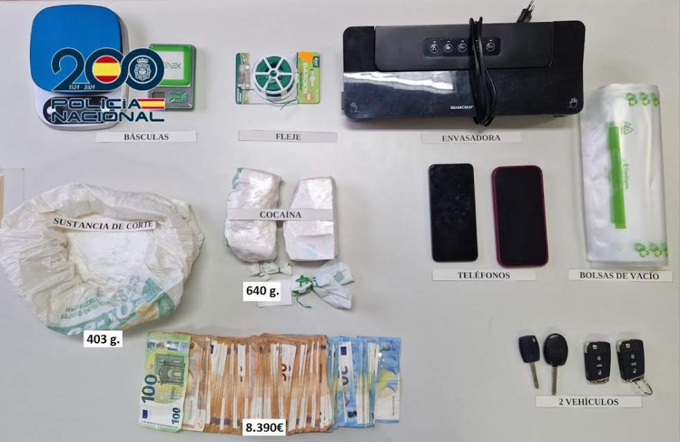 La operación culminó con una entrada y registro en una vivienda y un trastero vinculados a los investigados. En el operativo se intervinieron 8.390 euros en efectivo, 640,8 gramos de cocaína, 403,6 gramos de sustancia de corte, además de básculas de precisión, una envasadora y bolsas de vacío, así como teléfonos móviles y dos vehículos presuntamente utilizados para la actividad ilícita.