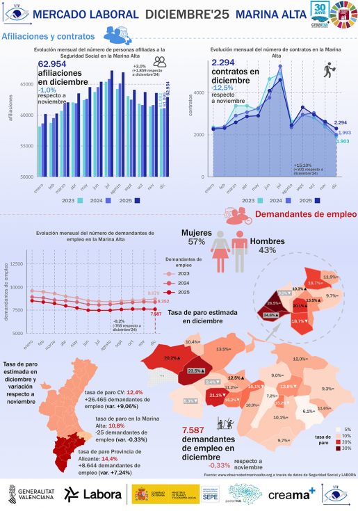 El análisis estima que la Marina Alta cerró el año con una tasa de paro del 10,76%, inferior a la registrada en diciembre de 2024 (12,03%) y mejor que las medias de la provincia de Alicante y de la Comunitat Valenciana.