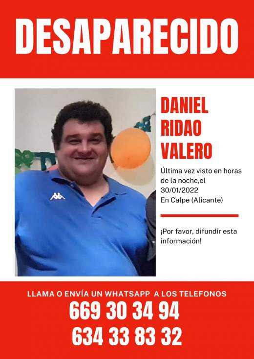 La familia de, Daniel Ridao Valero, 41 años, vecino de Calpe, ha denunciado en el cuartel de la Guardia Civil de Calpe su desaparición.