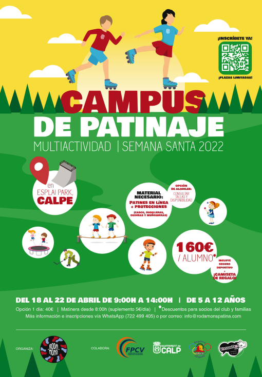 En colaboración con el Ajuntament y la Regidoria d’Esports de Calp, el Club de Patinaje RodaMons será el encargado de organizar este Campus de 5 días, dirigido a niños y niñas de 5 a 12 años que quieran iniciarse al patinaje en línea o mejorar sus habilidades con sesiones de Skatepark y diferentes talleres y juegos.
