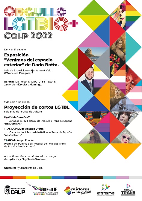 El Ayuntamiento de Calp ha informado en un comunicado que ha organizado un programa de actos para conmemorar el Día del Orgullo LGTBIQ que incluye la exposición de Dado Botta "Venimos del espacio exterior", la proyección de cortos LGTBI y una charla coloquio a cargo de Lydia Na y Eloy Sarrió Santana. Junto a estos actos, desde PSPV y Compromís han organizado también una manifestación el viernes 1 de julio. (Ver más)