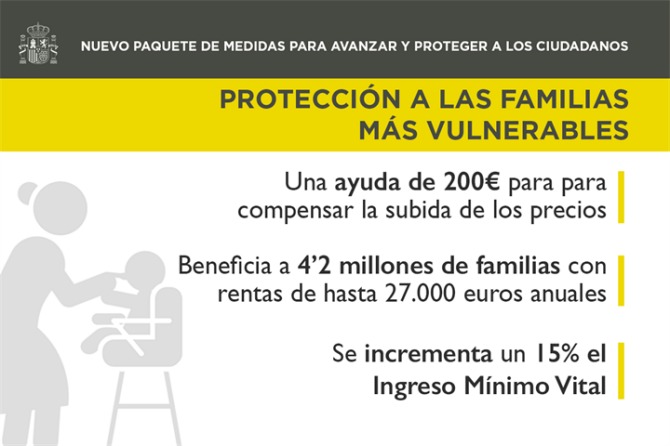 Entre estas medidas figura el abono extraordinario de 200 euros destinado a apoyar las rentas de las familias de clase media en un contexto de inflación. Con esta ayuda, que alcanzará a 4,2 millones de hogares, se reducirán las situaciones de vulnerabilidad económica que no están cubiertas por otras prestaciones sociales.