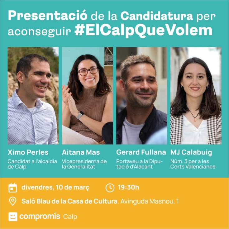 En un acto en el que también estarán presentes los candidatos autonómicos Aitana Mas, Gerard Fullana y María José Calabuig, Compromís per Calp escenificará que “hay otra forma de hacer política” y de este modo, poner en valor la concordia en la coalición después de un proceso de primarias que consideran ejemplar. En este sentido, desde el colectivo local agradecen la asistencia de los tres candidatos autonómicos y señalan que en Compromís “somos capaces de hacer política de forma distinta, y mientras otros partidos siguen promoviendo guerras internas más preocupados por quienes ocupará un lugar u otro, en Compromís tenemos muy claro que en este proyecto no sobra nadie y lo único importante es formar el mejor equipo posible para promover políticas que mejoran la vida de las personas”.