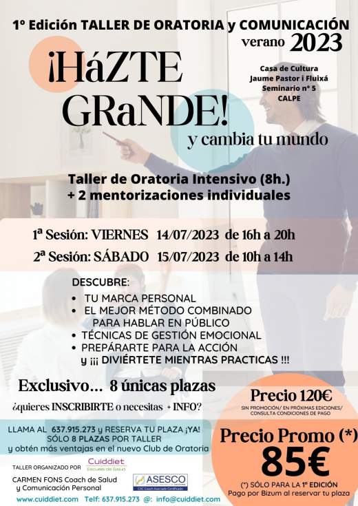 El próximo dia 13 de julio imparte una charla de desarrollo personal en la Casa de Cultura Jaume Pastor i Fluxá a la 19:30h “Descubre la belleza de tu voz” (el poder de la oratoria en el desarrollo personal). El día 14 de Julio arranca la 1ª Edición de los Cursos intensivos de oratoria y comunicación