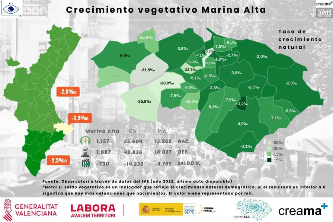 Lo datos no son alentadores. Pese al impacto positivo y peso de la comarca en muchos otros ámbitos sociales, la comarca se enfrenta a las cifras más bajas de crecimiento natural de la provincia de Alicante y de la Comunitat Valenciana. La Marina presenta una tasa de -3,92‰, mientras que la provincia un -2,5‰ y la autonomía un -2,79‰. Esta tasa de crecimiento natural supone el resultado de hacer una media entre la natalidad y la mortalidad.