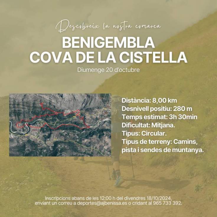 Para inscribirse en la actividad, es necesario hacerlo antes de las 12:00 h del viernes 18 de octubre, enviando un correo electrónico a deportes@ajbenissa.es o llamando al 965 733 392. La inscripción es gratuita e incluye cobertura de seguro de accidentes.
