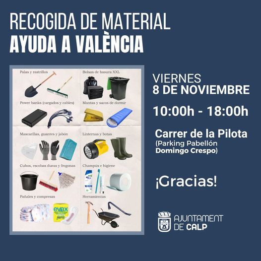 El Ayuntamiento de Calp ha organizado una recogida de material para asistir a los vecinos de València que se encuentran en situación de necesidad tras el reciente temporal. La colecta solidaria se llevará a cabo el viernes 8 de noviembre, de 10:00 a 18:00 horas, en el Carrer de la Pilota (Parking del Pabellón Domingo Crespo), donde los vecinos podrán aportar su ayuda a través de la donación de artículos esenciales.