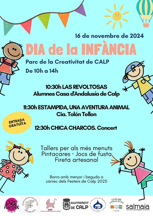 El Ayuntamiento de Calp invita a todos los niños, niñas y sus familias a disfrutar de una jornada repleta de diversión y entretenimiento en el Día Mundial de la Infancia, que se celebrará el sábado 16 de noviembre de 10:00 a 14:00 en el Parc de la Creativitat de Calp.