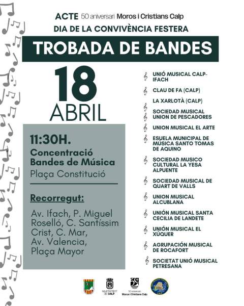 Calp acogerá mañana sábado 18 de abril una trobada de bandas de música enmarcada en la programación del 50 aniversario de las fiestas de Moros [...] Leer más...