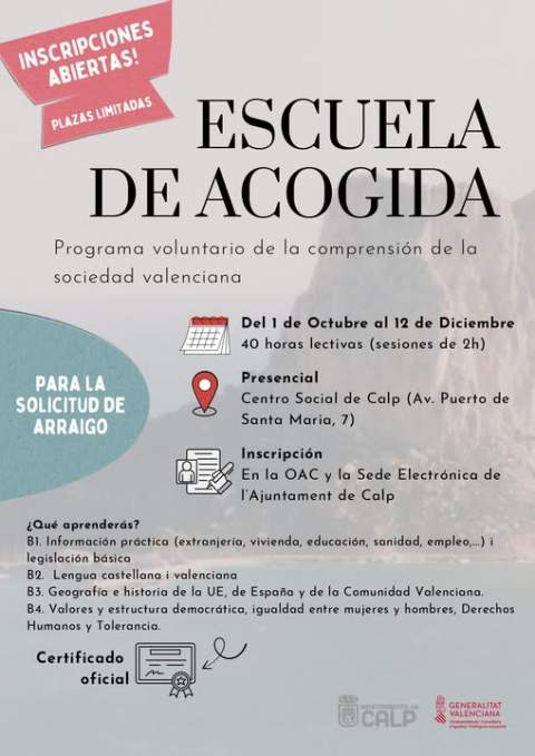 El Ayuntamiento de Calp ha puesto en marcha una nueva edición de la Escuela de Acogida, un programa voluntario de comprensión de la sociedad [...] Leer más...